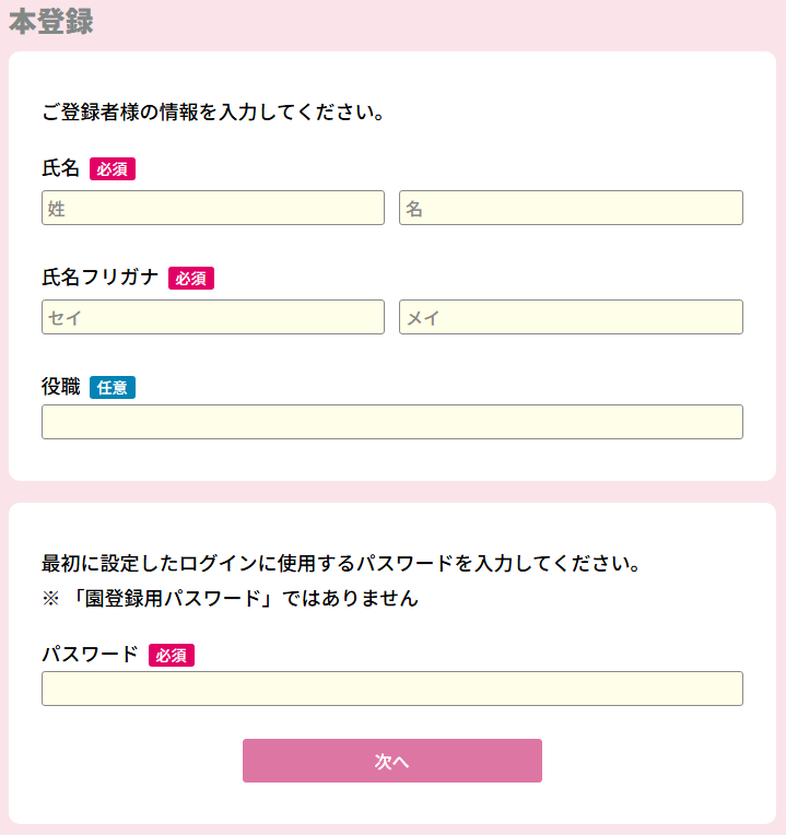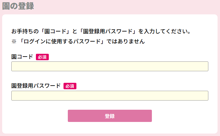 園コード・園登録用パスワードを入力します。
